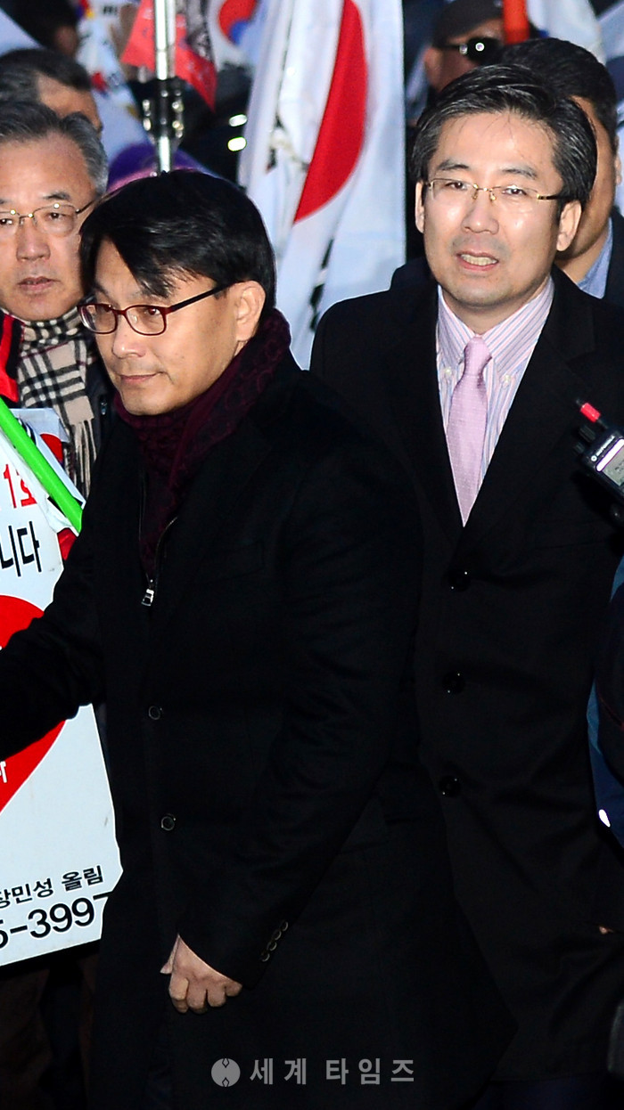 박근혜 전 대통령이 청와대 퇴거를 앞둔 12일 오후 서울 삼성동 박 전 대통령 자택에 자유한국당 윤상현 의원과 손범규 변호사가 모습을 보이고 있다. 2017.03.12.