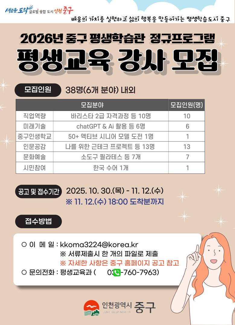 희망자는 강사신청서, 강의계획서 등 필수 서류를 갖춰 오는 11월 6일부터 12일까지 담당자 이메일로 제출하면 된다. 최종 합격 결과는 오는 11월 28일 중구 홈페이지(www.icjg.go.kr)를 통해 발표될 예정이다.
