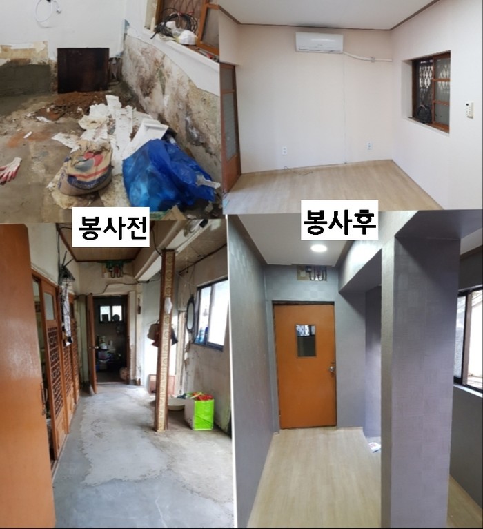 이날 봉사는 방치석 도배봉사 단장을 비롯해서 자원봉사자 12명이 약7시간동안 큰방2개, 주방, 거실의 도배 및 장판 교체 봉사를 하였다.