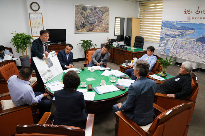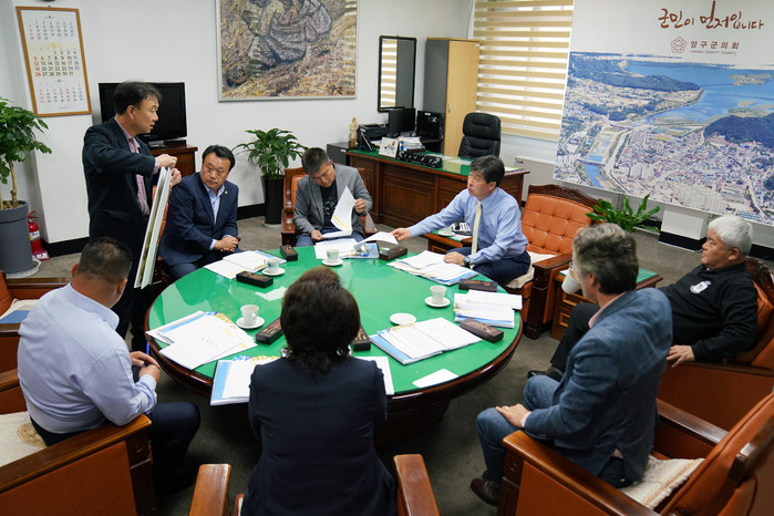 [양구군=세계타임즈 김민석 기자] 이상건 의장과 의원들이 8일 의장실에서 의원발의 조례안 제정, 안대리비행장 헬기 소음 측정 등의 내용으로 의원간담회가 열렸다.