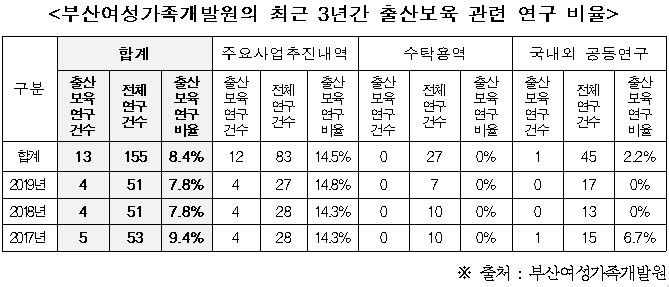 부산여성가족개발원은 부산의 여성, 가족, 보육, 저출산, 아동, 청소년 관련 정책연구와 정책개발을 위한 목적으로 설립되어 운영되고 있음에도 불구하고, 현재 양성평등과 여성권익 정책연구에만 치우쳐서 운영되고 관련 전문인력도 전무한 실정이다.