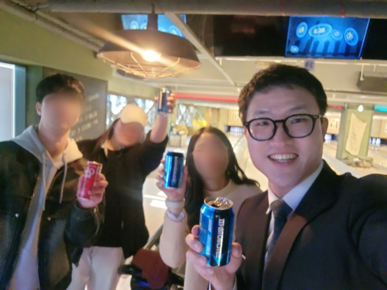 정 집사가 직장 동료들과 즐거운 시간을 보내고 있다.