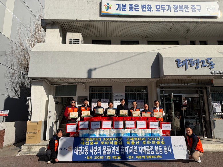 [중구 세계타임즈=이채봉 기자] 대전 중구 태평2동(동장 김상균)은 국제로타리 3680지구 대전중부 로타리클럽(회장 박영준)에서 지역 내 어려운 이웃을 돕기 위해 100여만 원 상당의 라면, 휴지, 김 등을 관내 취약가구 50가구에 전달했다고 밝혔다.