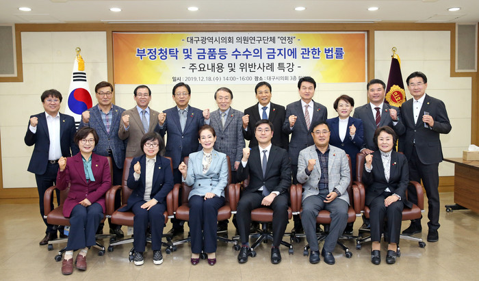 [대구=세계타임즈 한성국 기자] 대구광역시의회 의원연구단체 「연정(戀政)」(대표 김재우 의원, 회원 김지만, 전경원, 송영헌 의원)은 12월 18일(수) 오후 2시 시의회 3층 회의실에서 전체 의원 및 공무원을 대상으로 「부정청탁 및 금품등 수수의 금지에 관한 법률(김영란법)의 주요내용 및 위반사례」를 주제로 특강을 실시했다.