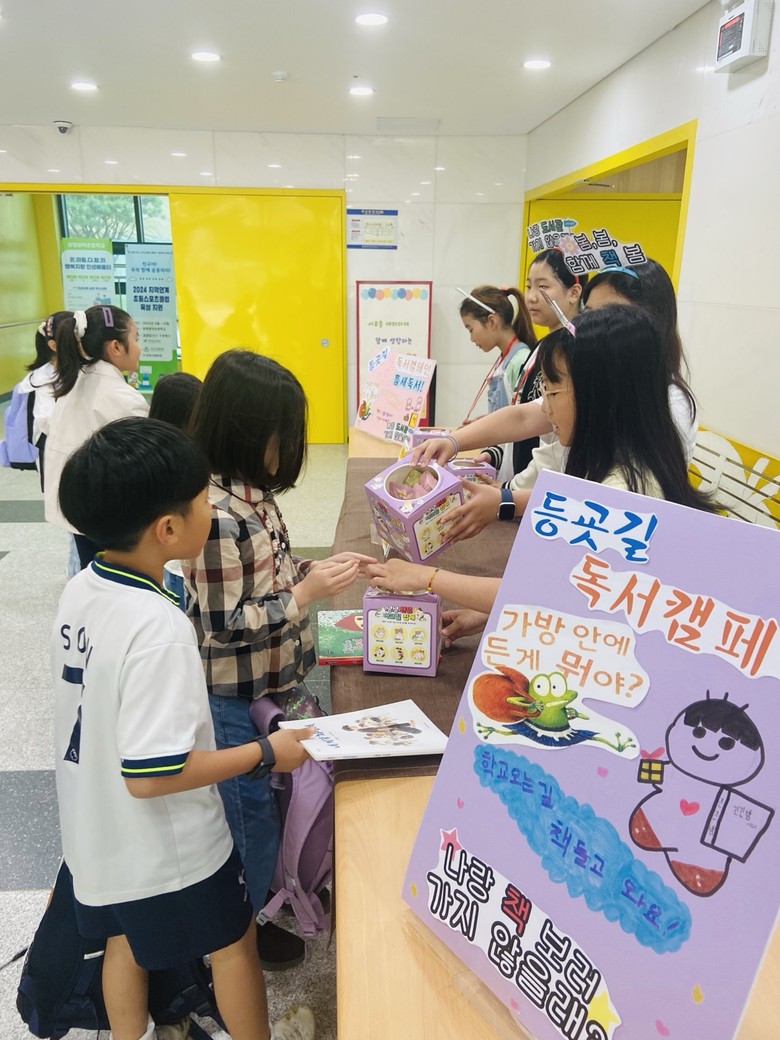 이번 활동은 본교 꿈나무둥지도서관 도서위원 학생들의 자발적인 운영 참여로 진행되었다. △매일 등굣길에 책 가져오기 △ 학교에서 틈틈이 독서하기를 홍보하는 프로그램으로 등굣길에 책을 가져온 학생들에게는 소정의 기념품(책갈피)을 증정하여 학생들의 즐거움을 더하였다.