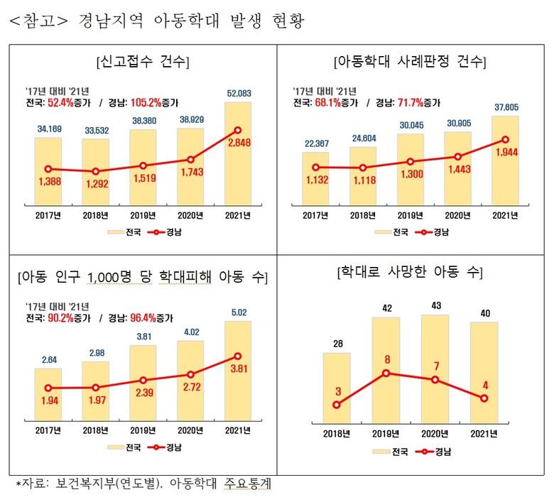보건복지부에서 발표한 경남지역 아동학대 주요통계를 살펴보면, 아동학대 의심 신고 건수는 2017년 1,388건에서 2021년 2,848건으로 105.2% 증가하였고, 아동학대 판정 건수는 2017년 1,132건에서 2021년 1,944건으로 71.7% 증가한 것으로 나타났다. 같은 기간 전국적으로 신고 건수는 52.4%, 학대판정 건수 68.1% 증가한 것과 비교하면 경남지역의 아동학대 신고 및 판정 건수 증가율은 전국 평균보다 웃도는 것으로 나타났다. 뿐만 아니라 경남지역에서 학대로 사망하는 아동도 매년 끊이질 않는 등 아동학대 문제에 대한 당국의 책임있는 조치가 요구되는 상황이다. <참고: 경남지역 아동학대 발생 현황>