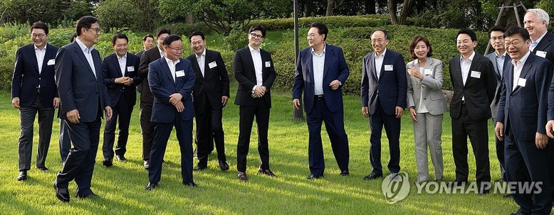 [세계타임즈 = 이채봉 기자] 윤석열 대통령이 24일 서울 용산 대통령실 앞 파인그라스에서 열린 국민의힘 신임 지도부 및 당 대표 후보 출마자들과의 만찬에서 한동훈 대표, 추경호 원내대표, 김재원 최고위원, 나경원 의원 등과 웃으며 대화하고 있다. 2024.7.24 [대통령실 제공]