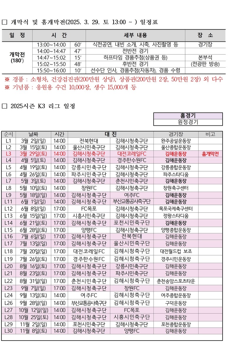 구단주인 홍태용 시장은 “시민들의 많은 참여와 열정적인 응원이 2025시즌 K3리그 우승의 원동력이 되어 K리그2로 출발하는 김해FC의 대전환이 글로컬 시티 김해의 초석이 되기를 기대한다”고 말했다.