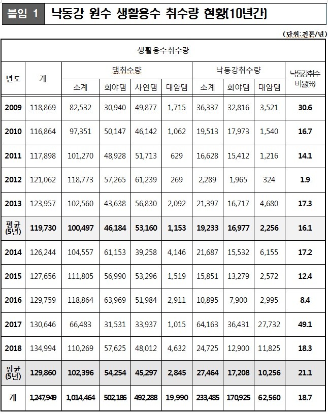 둘째 2014년 8월 이후 사연댐 수위 48미터 이하로 관리운영에 따른 2014년 전후(2009년~2018년) 낙동강 취수량 비율에 대하여 답변 드리겠습니다.