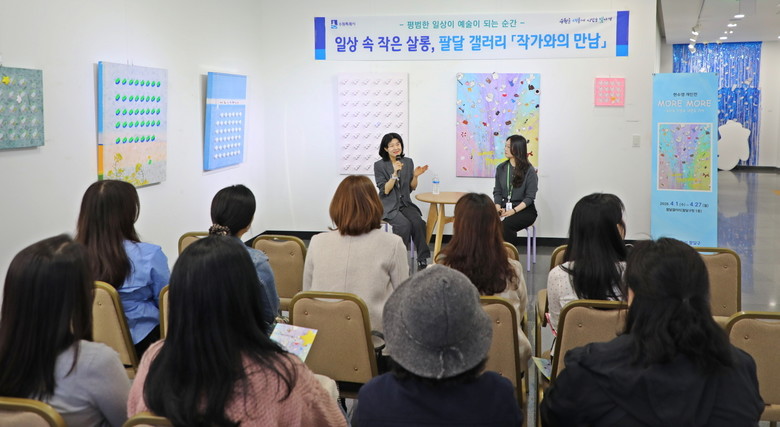 이번 행사는 4월 1일부터 27일까지 팔달 갤러리에서 열리는 현수영 작가의 개인전 ‘more more: 소비의 이면과 내면의 자아’의 일환으로 기획되었다. 이날 행사에서는 지역 주민 20여 명이 참석하며, 식전 공연을 시작으로 작가로부터 직접 작품 세계에 대한 설명을 듣고 궁금한 점을 나누는 작가와의 대담 및 질의응답 시간이 진행되었다.