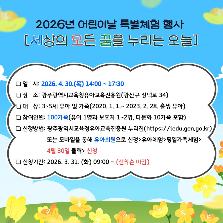 김경애 광주유아교육진흥원장은 “어린이날을 맞아 유아들이 마음껏 뛰어놀며 가족과 소통할 수 있는 다채로운 체험 프로그램을 준비했다”며 “온 가족이 참여할 수 있는 이번 행사에 많은 관심과 참여를 바란다”고 말했다.