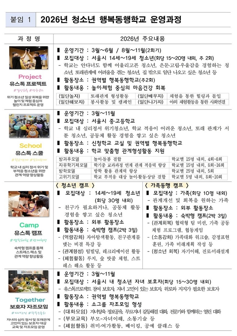 2026년 「행복동행학교」 자세한 내용 및 참가 신청 등은 청소년몽땅(www.youthnavi.net) 또는 행복동행학교 누리집(happywithseoul.kr)에서 가능하며, 자세한 문의는 ‘유스톡’ 사업단(02-6738-9639)으로 하면 된다.