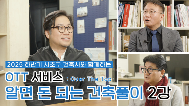 이번 콘텐츠에는 ㈜테바건축사사무소 한상환 건축사, 건축사사무소 틔움 차석헌 건축사, 소하건축사사무소 최성호 건축사가 참여했다. 현장에서 쌓은 경험을 바탕으로 한 설명과 건축사들 간 자연스러운 대화 호흡이 관전 포인트로 건축을 처음 접하는 구민들도 재미있게 시청할 수 있도록 구성됐다. 콘텐츠는 서초구 유튜브 채널인 ‘서초큐’(https://youtube.com/@seochoq?si=V18OdeYCMsxkh1up)에서 누구나 자유롭게 시청할 수 있다.