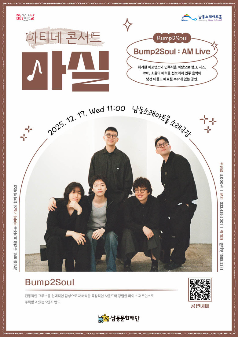 12월 17일(수) 오전 11시 남동소래아트홀 소래극장에서 관람할 수 있는 Bump2Soul의 ‘Bump2Souul : AM Live’는 전석 5,000원(정가 10,000원/문화가 있는 날 일괄 50% 할인 적용)에 엔티켓(https://buly.kr/B7b7ziT) 사이트에서 예매할 수 있으며, 마니아 카드를 적립한 관객들에게 내년도 마실 공연의 무료 관람권을 배포할 예정이다.