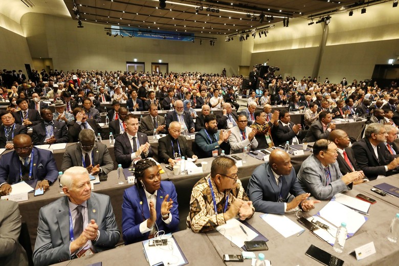 | ▲사진은 지난해 9월 18일 인천 영종도 그랜드 하얏트 인천 호텔에서 열린 HWPL 9.18 평화만국회의 9주년 기념식 평화지도자 콘퍼런스에서 이만희 HWPL 대표가 인사말을 경청하고 있는 참석자들의 모습. |