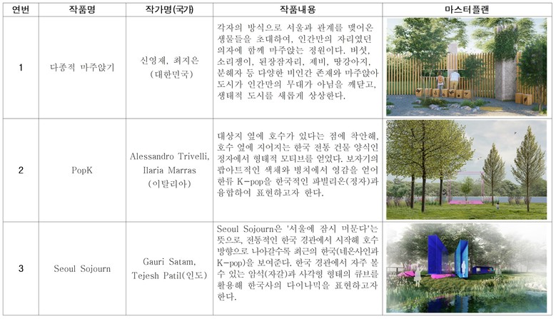 선정된 작품은 서울숲 내 주요 대상지에 개소당 약 250㎡ 규모로 조성되며, 창의적 해석을 통해 서울의 문화와 정원 담론을 제시한다.