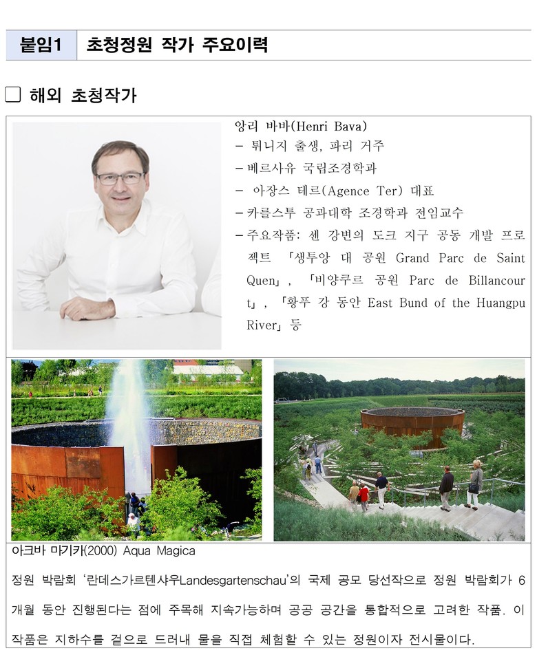 국제공모 정원과 함께 세계적 조경가 앙리 바바(Henri Bava)와 국내 대표 작가 이남진이 참여하는 초청정원 2개소도 조성된다. 두 초청정원은 국제적 시각과 서울 고유의 조경 감각이 대비·공존하는 구조로, ‘서울류’라는 박람회 주제를 상징적으로 구현하는 대표 예술정원으로 조성될 계획이다.