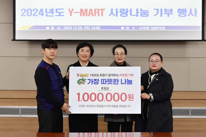 신수정 의장은 “도움이 필요한 이웃분들에게 따뜻한 온정을 드리고, 지역 상권을 활성하기 위해 노력하고 있는 Y-MART YB모임회의 이웃사랑 실천에 깊이 감사드린다”며, “고물가·고금리 등으로 지역 경제가 어려운 가운데 소외된 이웃들에게 조금이나마 도움이 되길 기대한다” 고 밝혔다.