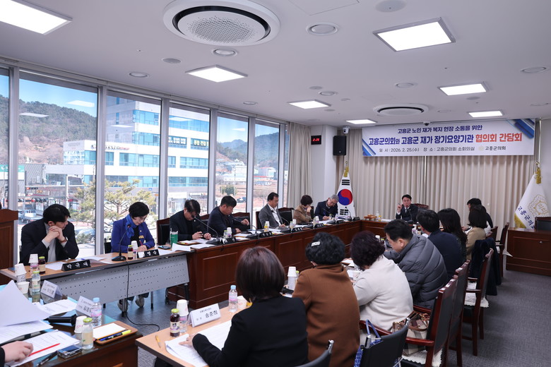 [고흥군 세계타임즈=우덕현 기자] 고흥군의회(의장 류제동)는 지난 2월 25일 군의회 소회의실에서 류제동 의장을 비롯한 군의원들과 송경률 협의회 대표 및 각 기관의 시설장, 관계 공무원 등 30여 명이 참석한 가운데 관내 노인 재가복지 최일선 현장의 고충을 청취하고 실효성 있는 지원 방안을 모색하기 위해 고흥군 재가장기요양기관 협의회와 소통 간담회를 개최했다.