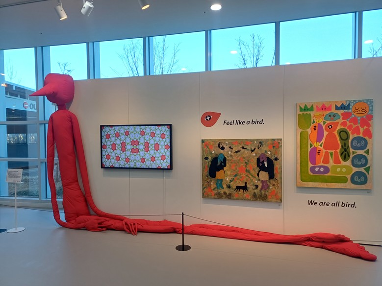 동자동휘 작가는 새를 영감으로 한 따뜻한 색감의 평면 작품과 영상을 통해 배움이 주는 회복과 성장의 메시지를 시민들에게 전달한다.