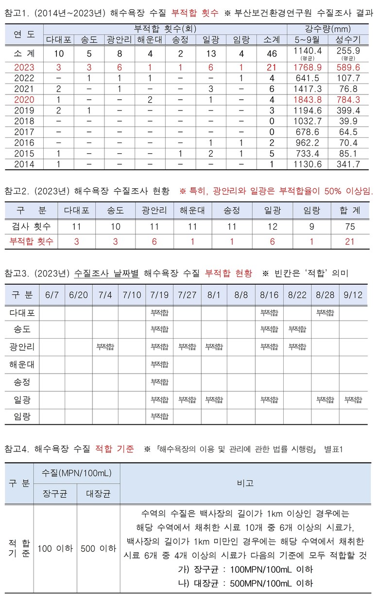 이종환 의원은 “우선, 부산보건환경연구원에서는 ‘2023년 강수량 증가에 따른 육상오염물질 유입량 증가’를 부적합 횟수가 급격하게 증가한 원인으로 ‘추정’하고 있으나, 2020년의 경우 2023년보다 강수량이 더욱 많았음에도 부적합 횟수는 단 4회에 불과하였다.”라며, “따라서, 단순히 강수량 증가만을 그 원인으로 ‘추정’할 것이 아니라 추가연구를 통해 그 원인을 정확히 파악하는 것이 급선무이다.”라고 지적했다.