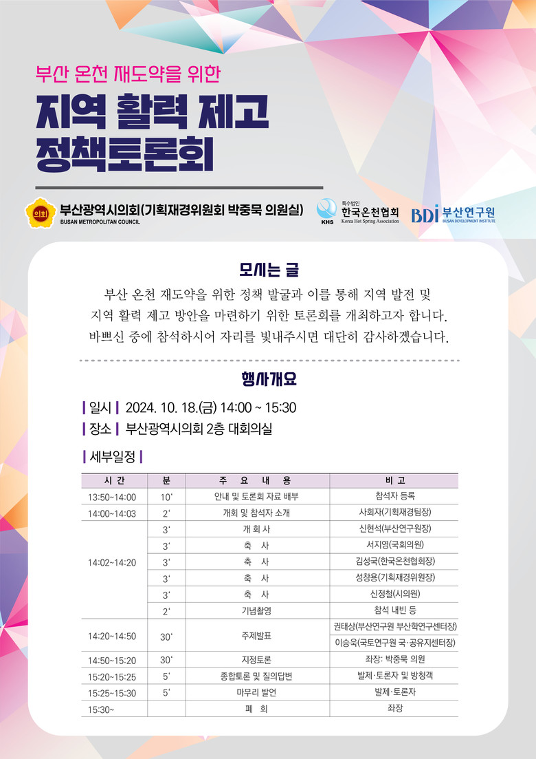 이번 행사는 지난 8월 27일, 제324회 임시회에서 박중묵 의원이 5분 자유발언을 통해 “부산 온천 부흥을 발판으로 글로벌 문화관광 도시 조성”을 촉구한 데에 이어 부산 온천 전문가와 공무원, 시민들이 부산 온천산업 활성화 방안을 논의하고 도시 경쟁력 강화를 모색하기 위해 마련되었다.