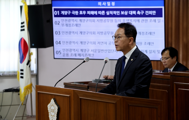 [계양구 세계타임즈=심하린 기자] 인천 계양구의회는 지난 5일 제261회 임시회 제2차 본회의에서 김경식 의원이 대표 발의한 「계양구 극한 호우 피해에 따른 실질적인 보상 대책 촉구 건의안」을 채택했다.