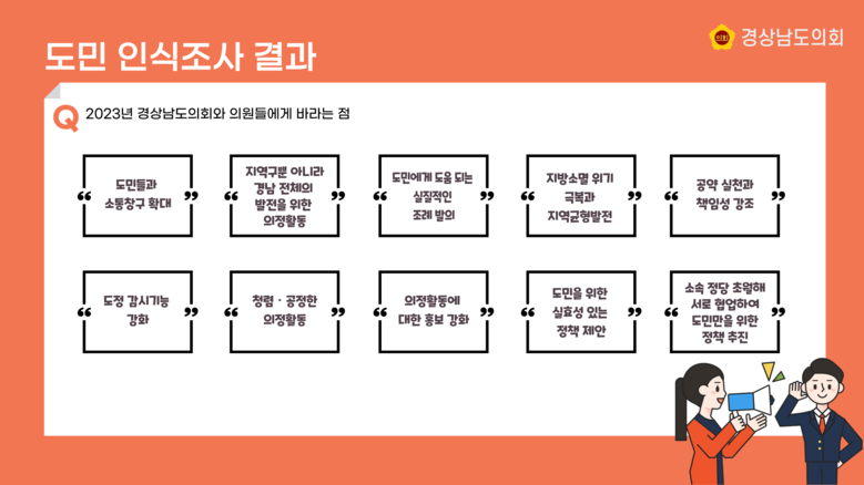 경상남도의회(의장 김진부)는 ‘2023년 경상남도의회에 바란다!’ 도민 인식조사를 지난 12월 1일부터 20일까지 실시하고 그 결과를 27일 발표했다.
