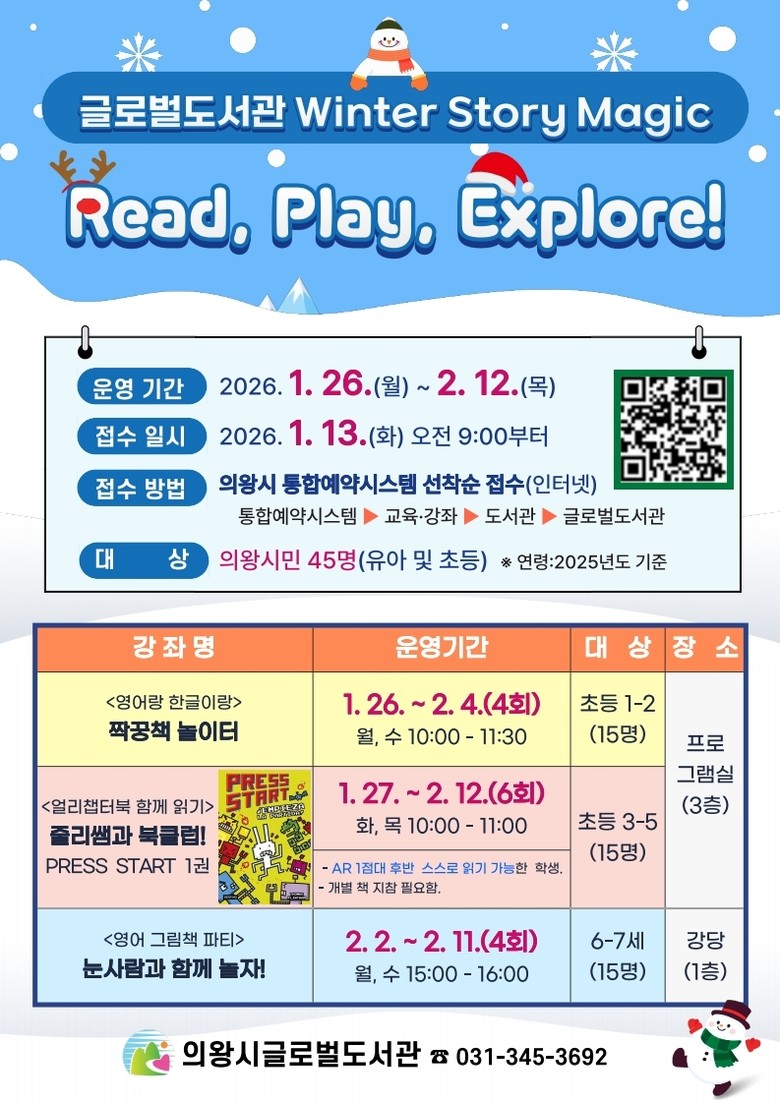 이번 프로그램은 ▲「영어랑 한글이랑」 짝꿍 책 놀이터(초등 1~2학년, 15명) ▲「얼리 챕터북 함께 읽기」 줄리쌤과 북클럽!(초등 3~5학년, 15명) ▲ 「영어 그림책 파티」 눈사람과 함께 놀자!(6~7세, 15명) 3개의 과정으로 이뤄져 있다.