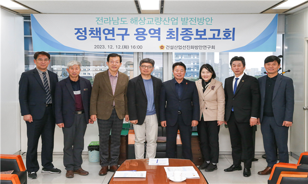 [세계타임즈=전남 우덕현 기자] 전남도의회 의원 연구단체인 ‘건설산업선진화방안 연구회(대표위원 임지락)’는 12월 12일 전남도의회 상임위실에서 ‘전라남도 해상교량산업 발전방안 정책연구용역’에 대한 최종보고회를 가졌다.