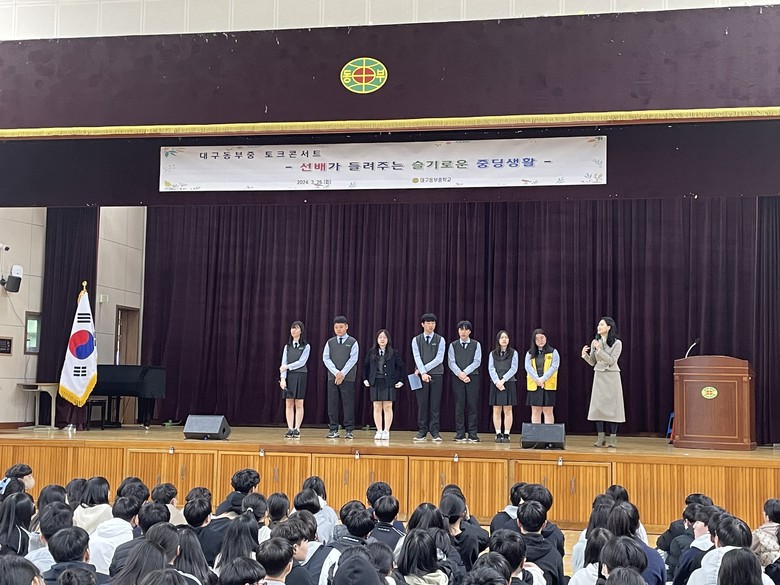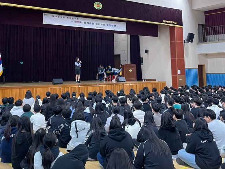 [대구 세계타임즈=한윤석 기자] 대구동부중학교(교장 최정애)는 지난 3월 26일(화) 15시 강당에서 3학년 선배들이 주축이 되어 중학교 1학년 전체 학생 286명을 대상으로 한 ‘토크 콘서트’를 실시하였다.
