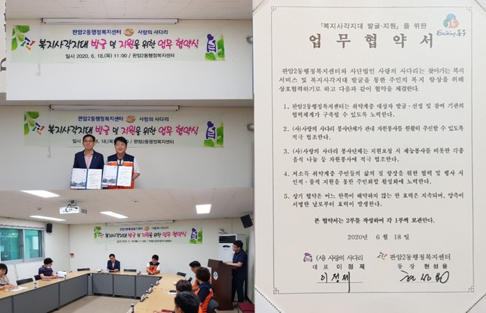 동구 판암2동 행정복지센터 현성용 동장은 “오늘 사랑의 사다리 밴드와 업무협약식을 계기로 위기가구를 발굴하여 판암2동 저소득층 주민들의 복지향상을 위해서 최선을 다하겠다.”고 말했다.