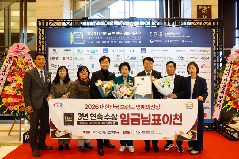 [이천시 세계타임즈=송민수 기자] 이천시(시장 김경희)가 22일 산업정책연구원(IPS)이 주관하는 ‘2026 브랜드 명예의 전당’ 시상식에서 농특산물 브랜드 부문 대상을 수상했다. 이로써 이천시는 해당 부문에서 3년 연속 대상이라는 영광을 안으며 대한민국 대표 프리미엄급 도농복합 도시로서의 위상을 공고히 했다.