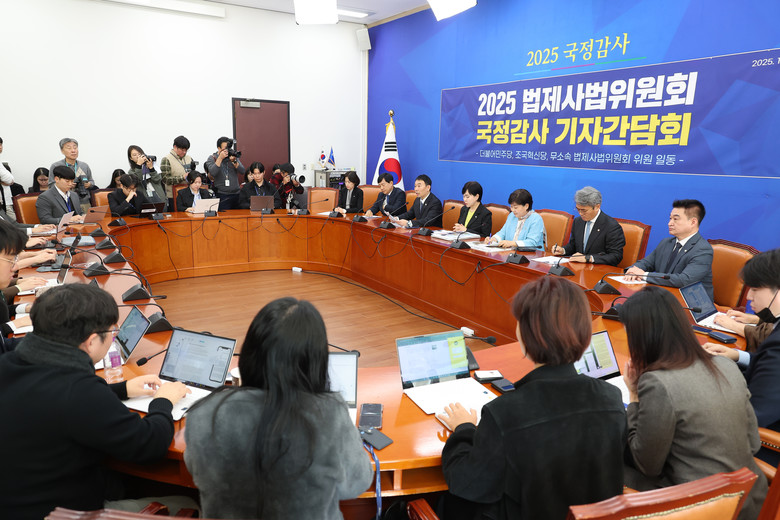 22일 서울 여의도 국회에서 더불어민주당, 조국혁신당, 무소속 법제사법위원회 위원이 참석한 가운데 열린 2025 법제사법위원회 국정감사 기자간담회에서 더불어민주당 김용민 의원이 발언하고 있다. 2025.10.22