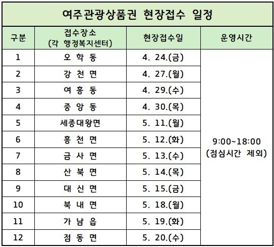 4월 24일 오학동부터 현장 접수를 시작하며 접수 장소는 해당 읍.면.동 행정복지센터이다. 자세한 사항은 여주시 관광체육과(031-887-2069) 또는 여주세종문화관광재단 관광기획팀(031-881-9662)으로 문의하면 된다.