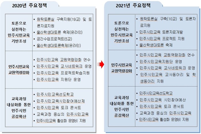 학생 대토론 축제, 학생 참여 예산제, 민주시민교육 토크 콘서트, 지원단 구성, 민주시민교육 교사 및 학생 동아리, 프로젝트 학습 지원, 교원 역량강화 연수 등을 추진할 예정입니다.*