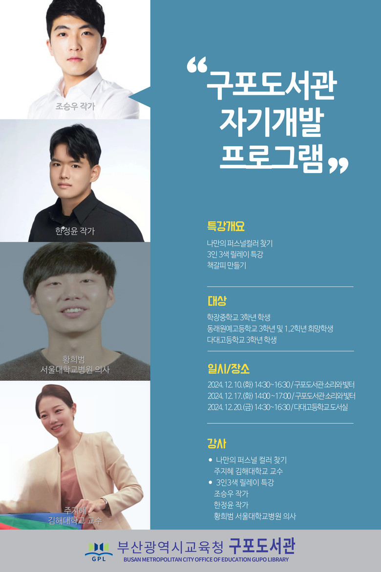 주낙성 구포도서관장은 “이번 프로그램이 수능으로 지친 학생들의 심리적 안정과 재충전을 돕고, 상급학교로 진학하는 학생들에게 자신만의 공부법을 알려줘 아이들의 성장과 발전에 도움이 되길 바란다”고 말했다.