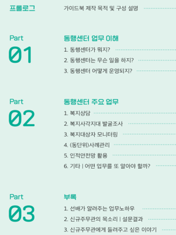 가이드북은 ▲동행센터 업무 이해, ▲복지상담, 사각지대 발굴, 모니터링, 인적안전망, 사례관리 등 주요 업무, ▲선배주무관들의 현장 노하우와 신규주무관 설문 결과를 담은 부록으로 구성하였다.