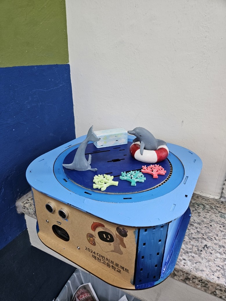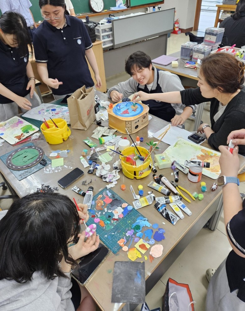 미술중점반 학생 17명과 AI융합교육 학생 18명이 디자이너와 디벨로퍼의 역할을 분담하고 창의적인 아이디어를 구체화하여, 사람이 센서에 다가가면 배경 음악(BGM)이 흘러나오면서 작품이 움직이는 혁신적인 전시물이 완성됐다.