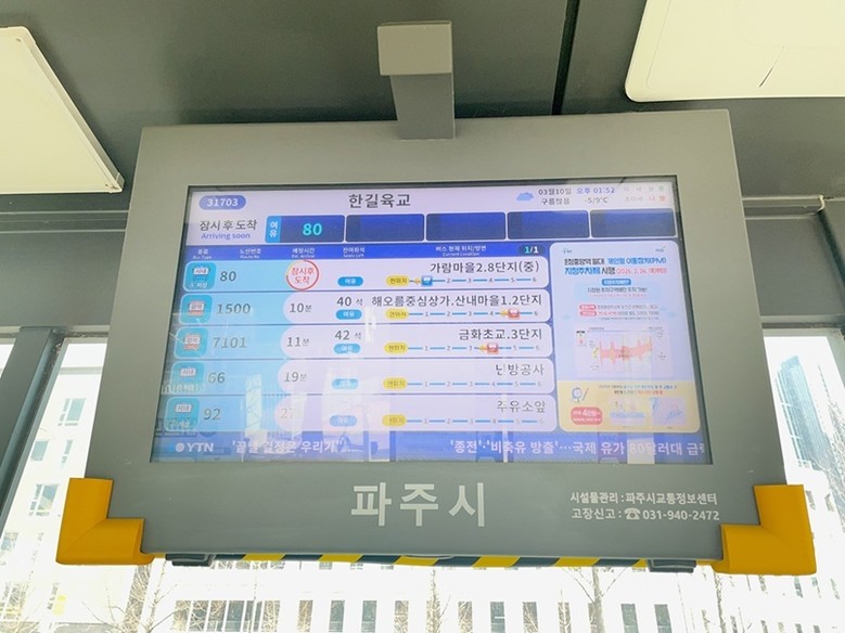 파주시 관계자는 “버스정보안내기 확대 설치를 통해 시민들이 보다 편리하게 대중교통 정보를 이용할 수 있을 것으로 기대한다”라며 “앞으로도 대중교통 이용 환경을 지속적으로 개선해 시민 중심의 교통서비스를 제공하겠다”라고 말했다.