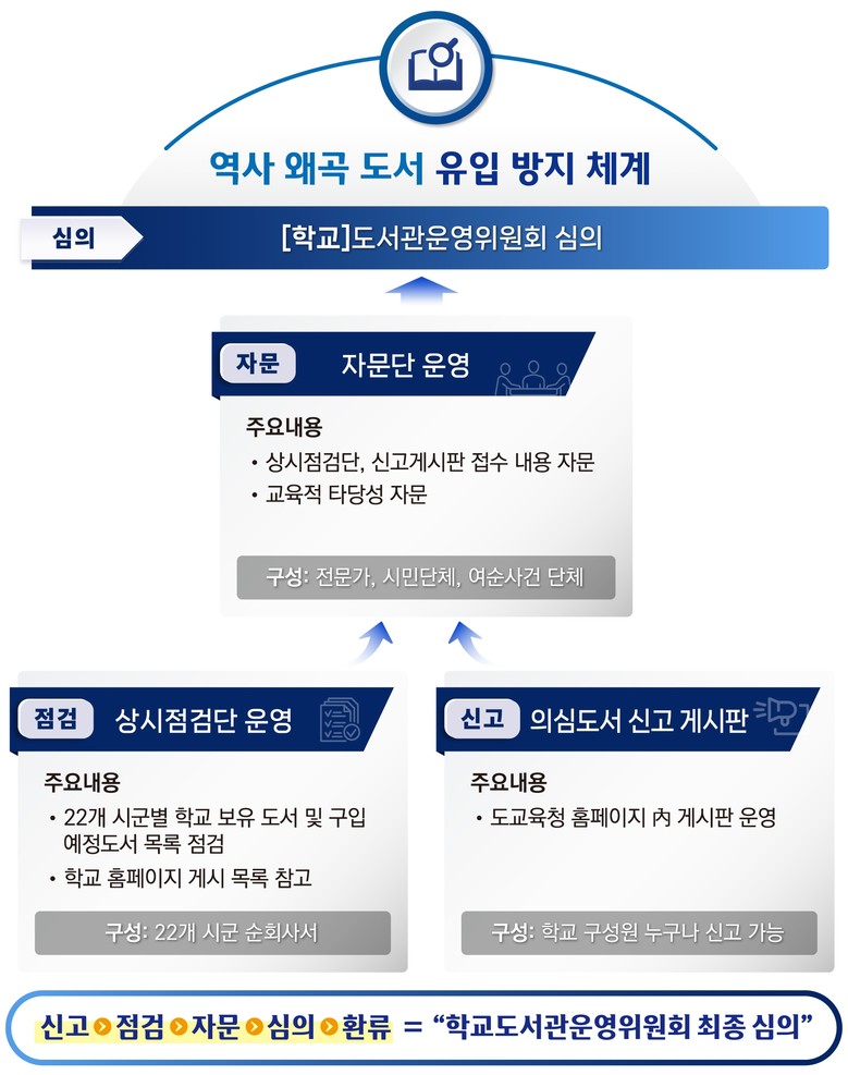 이를 토대로 ▲ 22개 시·군별 상시점검단 운영 ▲ 도교육청 홈페이지 내 의심도서 신고 게시판 운영 ▲ 전문가 자문단 운영 등으로 이어지는 ‘신고-점검-자문-심의’ 단계별 체계를 구축해 현장에 적용하고 있다.