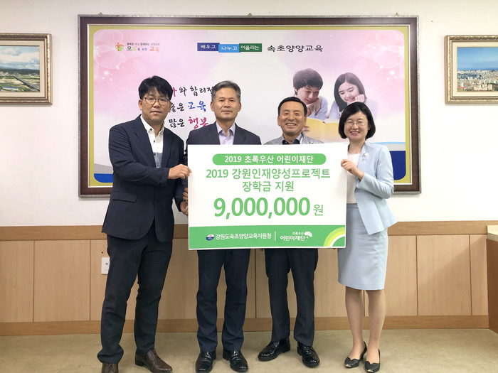 [강원도=세계타임즈 김민석 기자] 초록우산 어린이재단 강원지역본부(본부장 고주애)가 10일 오후 2시 강원도속초양양교육지원청에서 관내 재능아동 지원을 위한 인재양성 장학금 900만 원을 전달했다.