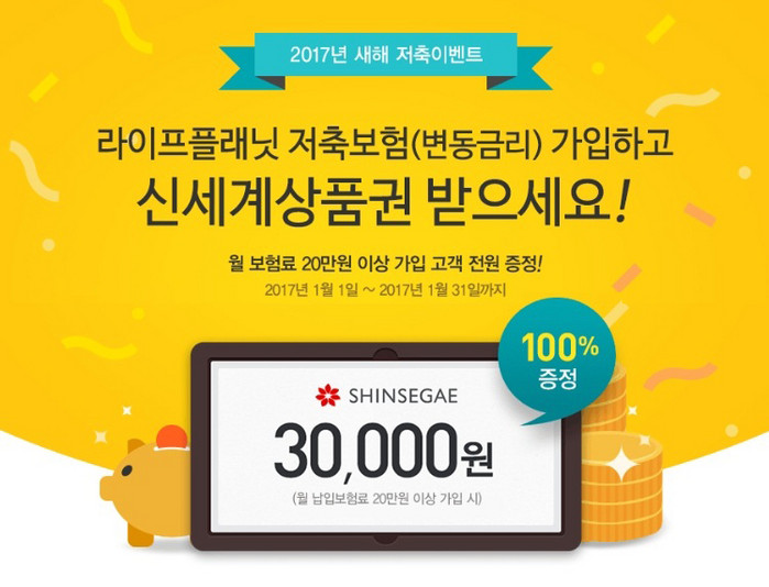 라이프플래닛은 오는 1월 31일까지 '(무)꿈꾸는e저축보험'과 디지털 방카슈랑스 상품 '(무)라이프플래닛b저축보험'의 신규 가입자 중 월 보험료 20만원 이상 가입하는 고객 전원에게 신세계 모바일 상품권(3만원권)을 증정한다.