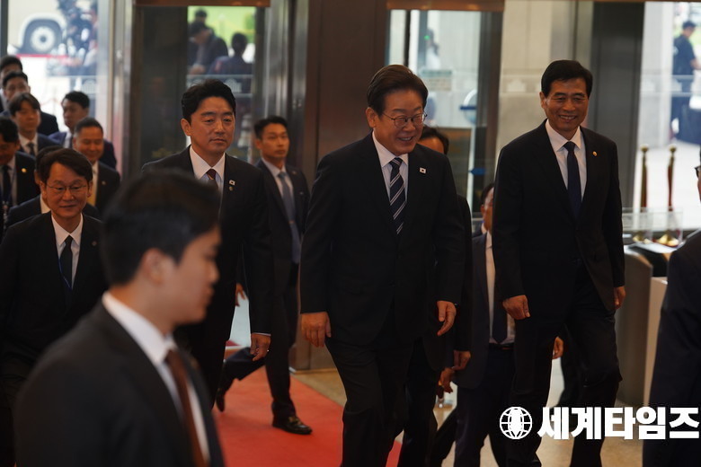 '이재명' 대통령 첫 국회 시정연설을 위해 서울여의도 국회의사당 안으로 들어서고있다.