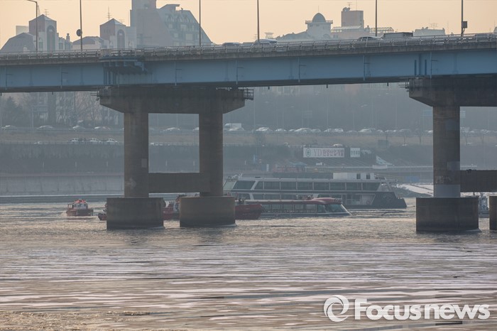 (서울=포커스뉴스) 26일 오후 서울 한강 영동대교 인근을 지나던 한강유람선이 침수, 구조대원들이 구조활동과 견인 작업을 하고 있다.