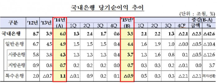 18일 금융감독원이 낸 '2015년 국내은행 영업실적 잠정치' 자료에 따르면 작년 국내은행의 당기순이익은 3조5000억원으로 전년 6조원과 비교해 무려 42.6%(2조5000억원) 감소했다. 국내은행이 3조원대 당기순익을 기록한 것은 2013년(3조9000억원) 이후 2년 만이다.