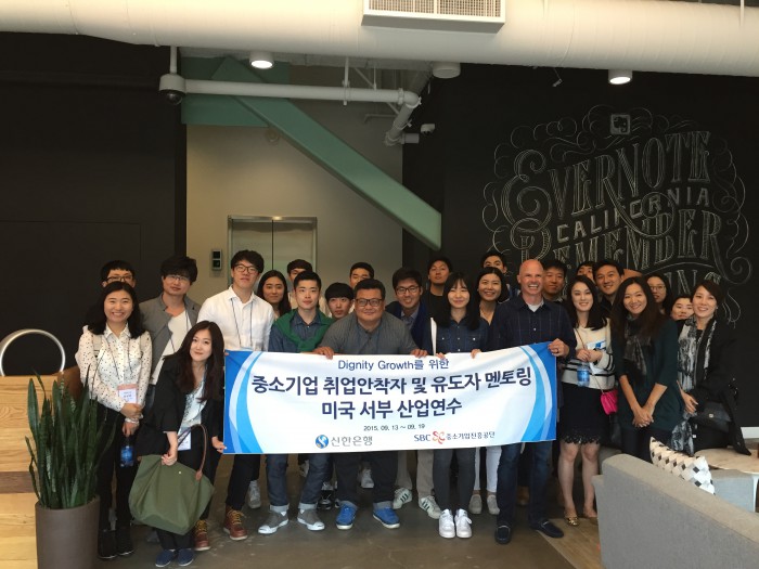 신한은행 관계자는 "'따뜻한 금융'이라는 신한은행의 경영철학하에 매년 15억원의 재정지원과 중소기업 지원 및 연수분야에서 쌓은 중진공의 역량이 합쳐지면서 보다 실질적인 취업프로그램으로 진화하고 있다"고 설명했다.신한은행과 중소기업진흥공단이 함께 시행하는 '으뜸기업-으뜸인재 매칭사업'을 통해 중소기업에 취업한 청년들과 멘토들이 미국 서부산업연수 중 현지기업체를 방문 후 기념촬영하는 모습.<사진제공=신한은행>