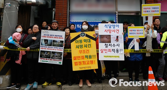 경찰은 박씨와 이씨에 대한 살인죄 검토 여부를 결정하고 18일 이들을 검찰에 송치할 계획이다.(부천=포커스뉴스) 생후 2개월 영아를 폭행해 숨지게 한 아버지 박모(23)씨와 어머니 이모(23)씨의 현장검증이 실시된 17일 오후 경기도 부천시 오정구 피의자 자택 앞에서 아동학대방지시민모임 회원들이 피의자 살인죄 적용을 촉구하는 손피켓을 들고 있다. 2016.03.17 오장환 기자
