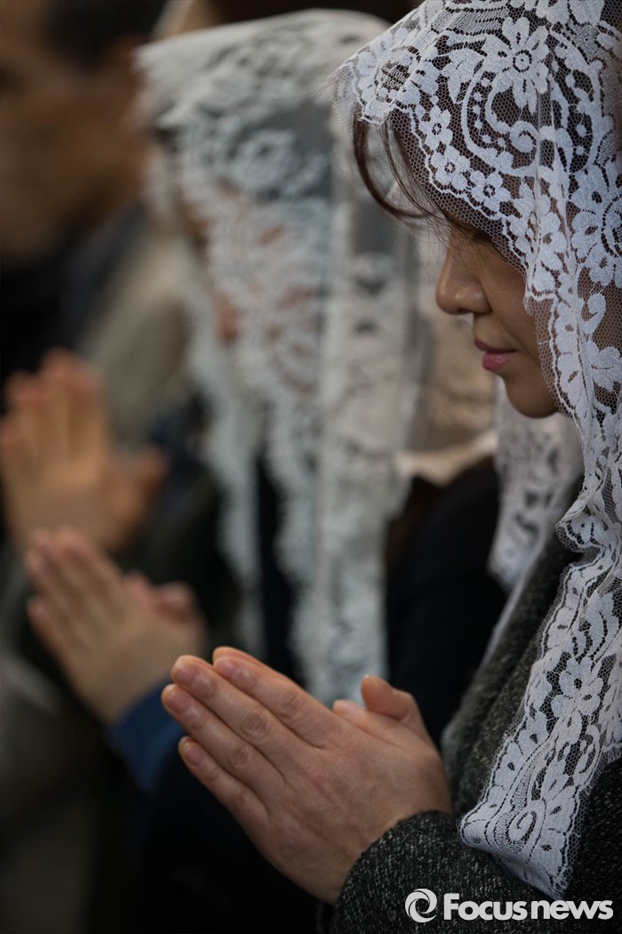 (서울=포커스뉴스) 부활절을 맞아 27일 정오 서울 중구 명동성당에서 열린 '예수 부활 대축일 미사'에 신도들이 참석해 기도하고 있다.
