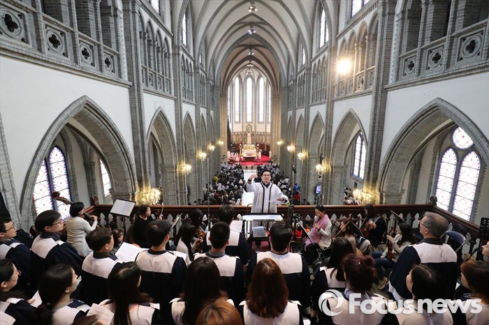 (서울=포커스뉴스) 부활절을 맞아 27일 정오 서울 중구 명동성당에서 열린 '예수 부활 대축일 미사'에 신도들이 참석해 기도하고 있다.